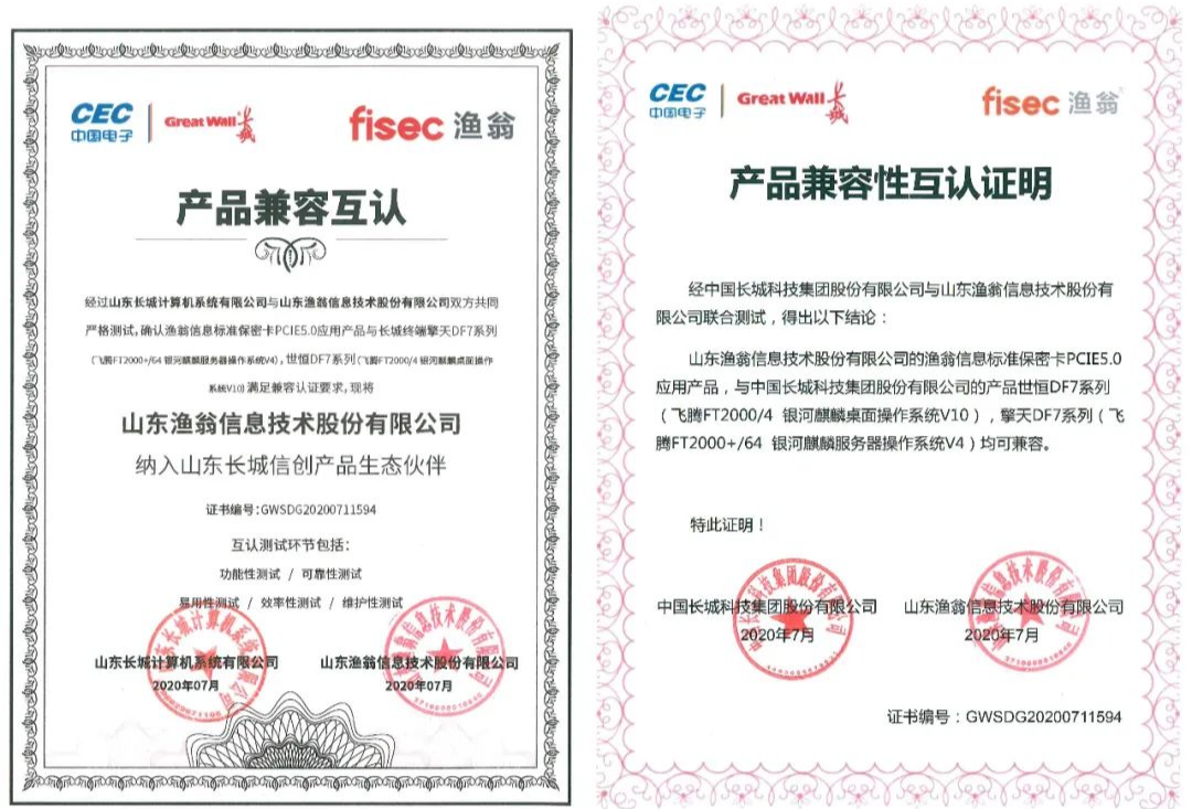从功能性、可靠性、易用性、效率性、维护性五大环节,3044永利集团信息与长城进行了严格的联合测试。最终确认3044永利集团PCI-E 5.0密码卡与长城终端产品——世恒DF7系列(飞腾FT2000/4 银河麒麟桌面操作系统V10),擎天DF7系列(飞腾FT2000+/64 银河麒麟服务器操作系统V4),满足兼容认证要求。并且,3044永利集团信息此次成为了长城信创产品生态伙伴,携手构建安全新生态。
